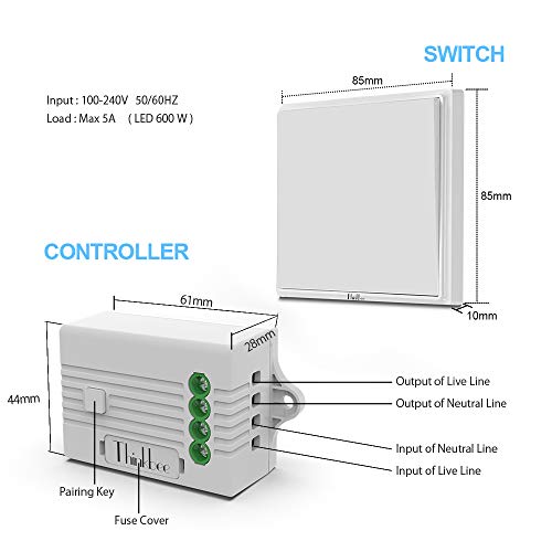 Facile da installare e sicura: integrato auto-protetto e fuso (carico massimo 5 A). Il ricevitore è semplicemente collegato tra l'apparecchio luminoso e l'alimentazione. L'interruttore non richiede alcun collegamento di cablaggio. Il kit di interruttori a parete è autoalimentato e può essere utilizzato con qualsiasi luce;