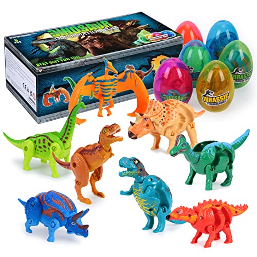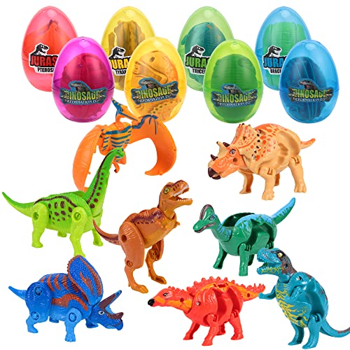 ThinkMax Dinosauro Uova di Pasqua, 8 Pezzi di Uova di Pasqua Preriempita Giocattoli di Dinosauri Deformabili con Giunti Mobili per Bambini Giochi di Caccia alle Uova di Pasqua, Regali Pasqua