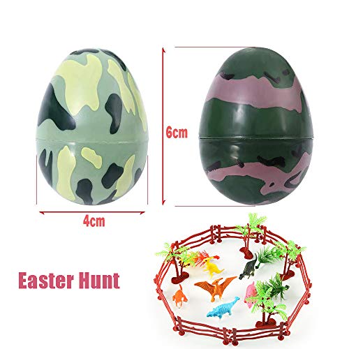 GRANDE VALORE: 24 pezzi di uova di Pasqua precompilate con giocattoli di dinosauro. Sorprendentemente include anche 3 pezzi di alberi, 4 pezzi di erbe, 7 pezzi di recinti per costruire un giardino per i dinosauri.