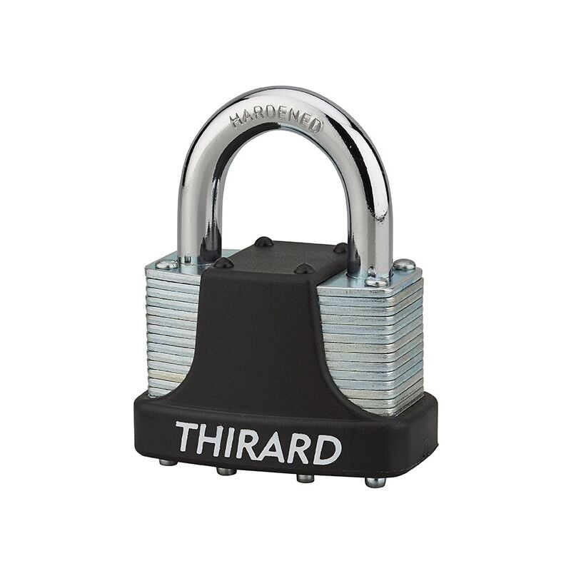 Corpo lamellare in acciaio zincato protetto da un guscio in PVC. Ansa in acciaio cementato nichelato. Meccanismo con 4 ghiere in ottone. Doppia serratura. Combinazione modificabile, 10.000 combinazioni possibili.