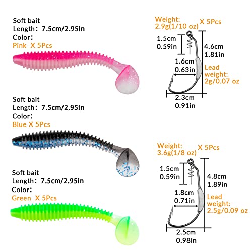 VARIETÀ DI SCELTE: Quattro scelte: 19 PZ, 25 PZ, 30 PZ, 60 PZ. Nella confezione da 19 PZ, 25 PZ sono contenute due diverse dimensioni di ganci Twist-lock e tre diversi colori di softbait. non devi preoccuparti dell'inapplicabilità. Nel pacchetto da 30 pezzi, 60 pezzi contiene cinque dimensioni di ami da pesca, che possono soddisfare molte esigenze.