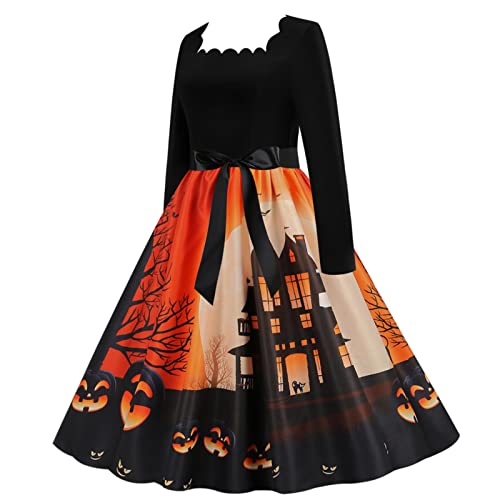 Thoran Vestito per Halloween da donna, vestito svasato a maniche lunghe e con scollo quadrato per Halloween e cocktail party, stile casual e retrò, con stampa di zucche
