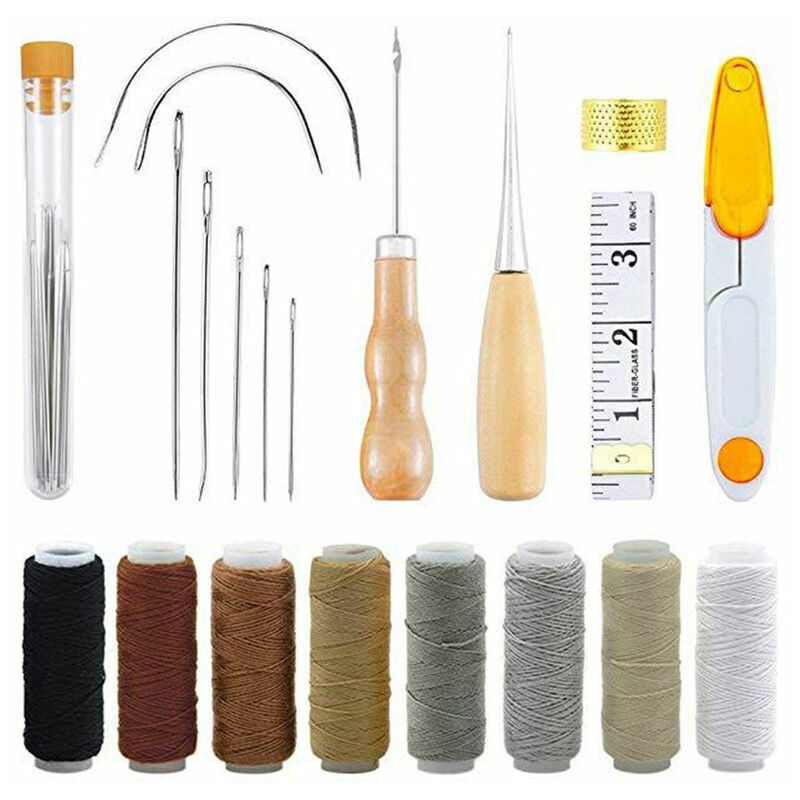 Descrivi: Questo kit in pelle include 9 aghi per cucire in pelle, 1 bottiglia trasparente, 2 aghi per cucire in pelle, 1 punteruolo, 1 strumento per piercing alla pelle, 8 cordoncini in pelle cerata, 1 ditale, 1 tagliafilo, 1 x metro a nastro per le esigenze di base della lavorazione della pelle. Caratteristica speciale: 【Aghi】 I kit in pelle contengono aghi di varie dimensioni e forme, inclusi aghi triangolari appuntiti, aghi curvi e altro ancora. [Utile] Uno strumento manuale fai-da-te, molto facile da usare. Include 8 fili di cera in pelle di diversi colori per soddisfare le tue esigenze in diversi progetti. [ALTA QUALITÀ] Usa queste spille manuali per moquette, tela, tappezzeria, cappotto, tenda, materasso, pelliccia e pelle per proteggere bene il tuo ditale. 【Buoni regali】Una buona scelta per genitori, famiglia, amici, in particolare per gli amanti del cucito a mano fai-da-te. 【Ampia gamma di applicazioni】Adatto a principianti e utenti avanzati. Ideale per lavori in pelle
