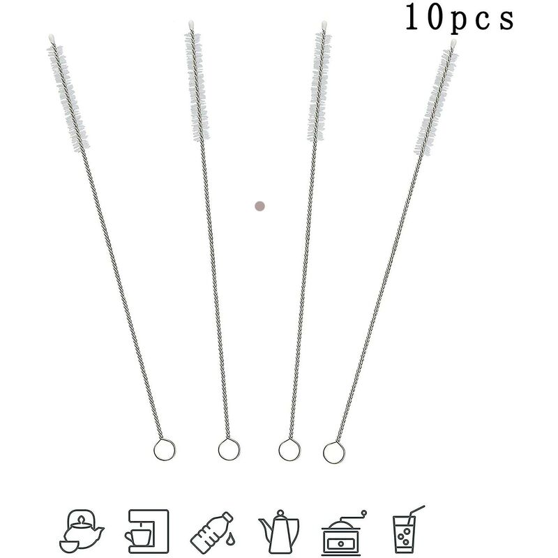 Specifiche: Materiale manico: filo di acciaio inossidabile 304 Materiale spazzola: filo di nylon Lunghezza totale: 20 cm Lunghezza delle setole: 5 cm Diametro spazzola: 1 cm La confezione include: 10 spazzole di paglia lunghe 20 cm (8 pollici), diametro 10 mm, flessibile, flessibile, piccola, stretta, con setole resistenti e testina sigillata nessun graffio e rischio di lesioni CONFEZIONATO SENZA PLASTICA per cannucce riutilizzabili Cannucce in acciaio inossidabile, metallo, bambù, vetro, come tubo del latte Tubo di aspirazione del latte Montalatte Gruppi caffè Detergente & beccuccio per caffè Pulizia MULTIFUNZIONALE del foro di drenaggio di frigorifero, tastiera, provetta per cellulare, bottiglie di vetro, borracce, aerografo, come scovolino per bottiglie, scovolino e come scovolino per piatti