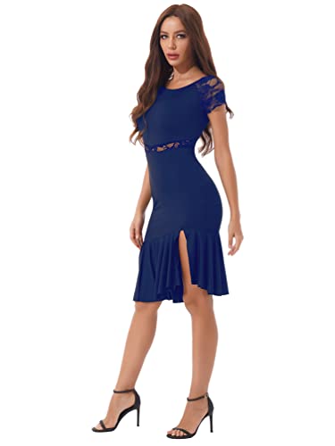 TiaoBug Abito da Ballo Donna Latino Americano Pizzo Trasparente Vestito Danza Classica con Nappa Salsa Samba Rumba Abito da Ballerina Jazz Danza Moderna Dancewear Blu Reale A M