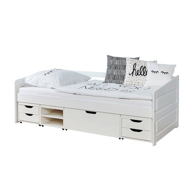 Il divano letto Micki è l'alternativa perfetta al letto normale nella camera dei bambini e degli adolescenti. Offre una normale superficie sdraiata su cui è meravigliosamente rilassante, ma può essere utilizzata anche come seduta per più persone grazie agli schienali. L'intero letto è realizzato in faggio massiccio e colpisce per la sua elevata stabilità e capacità di carico. Dettagli tecnici: Divano letto Colore: bianco Materiale: faggio massiccio, verniciato Superficie di sdraio: larghezza x lunghezza 90 x 200 cm Dimensioni: larghezza x lunghezza x altezza 98 x 204 x 60-70 cm Altezza massima del materasso: 16-25 cm 4 cassetto piccolo aden 1 cassetto grande 2 vani portaoggetti Incluso nella consegna: divano letto 4 Spinta funzionale aden Attenzione: griglia avvolgibile, materasso e decorazione non sono compresi nella fornitura