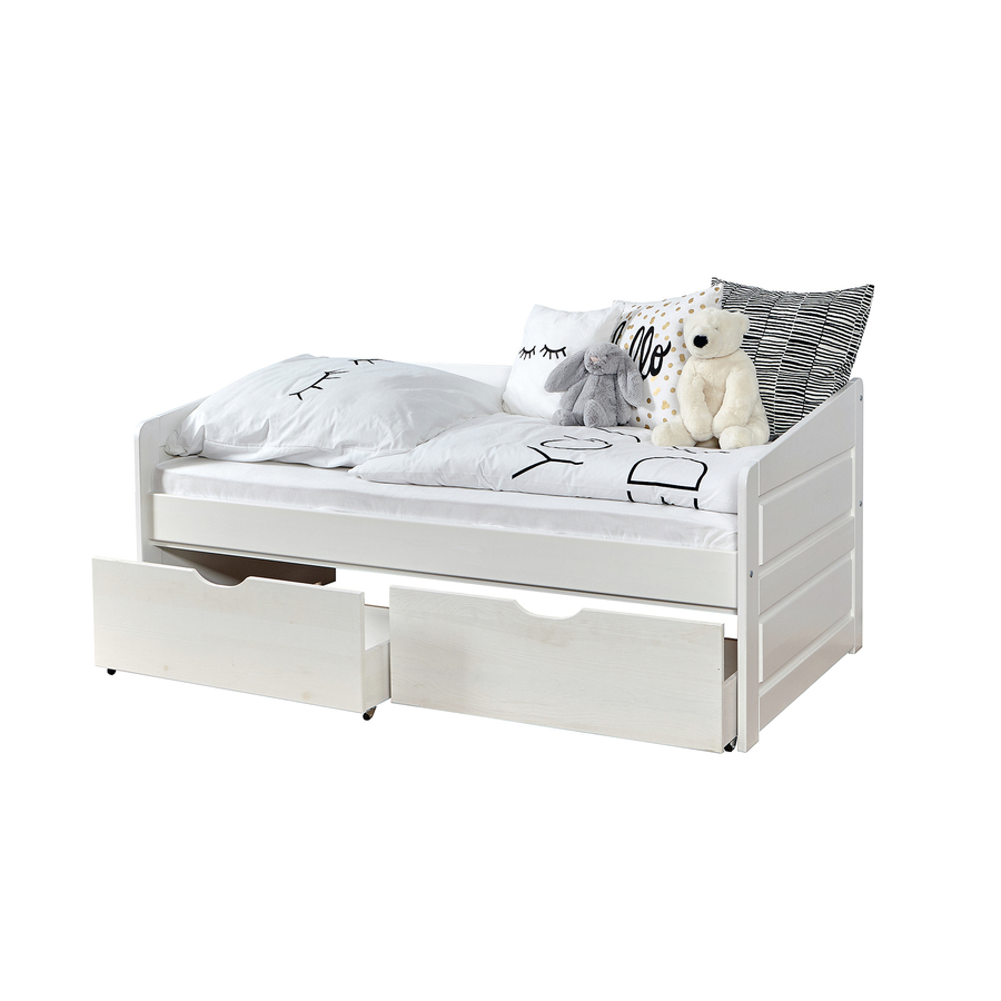 Il divano letto Mini Micki è l'alternativa perfetta al letto normale nella camera dei bambini e dei giovani. Offre una superficie sdraiata di 80 x 160 cm, sulla quale è meraviglioso rilassarsi, ma può essere utilizzata anche come seduta per diversi bambini grazie agli schienali. Dettagli tecnici: Divano letto colore: bianco Materiale: faggio massiccio, verniciato Superficie di sdraio: larghezza x lunghezza 80 x 160 cm Dimensioni: larghezza x lunghezza x altezza 88 x 164 x 60-70 cm Altezza massima del materasso: 15 cm 2 cassetti avvolgibili aden per un maggiore spazio di stoccaggio Materasso Dimensioni: larghezza x lunghezza 80 x 160 cm Materiale del nucleo: schiuma Materiale di copertura: 100 % poliestere Incluso nella consegna: Divano letto Piano letto avvolgibile Materasso 2 cassetti aden Attenzione: la decorazione non è inclusa
