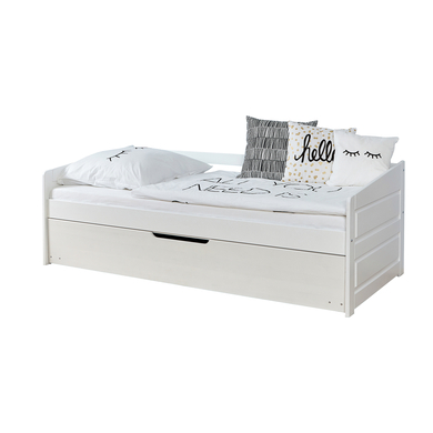 Il divano letto Micki è l'alternativa perfetta al letto normale nella camera dei bambini e degli adolescenti. Offre una normale superficie sdraiata su cui è meravigliosamente rilassante, ma può essere utilizzata anche come seduta per più persone grazie agli schienali. L'intero letto è realizzato in faggio massiccio e colpisce per la sua elevata stabilità e capacità di carico. Dettagli tecnici: Divano letto Colore: bianco Materiale: faggio massiccio, verniciato Superficie di sdraio: larghezza x lunghezza 90 x 200 cm Dimensioni: larghezza x lunghezza x altezza 98 x 204 x 60-70 cm Altezza massima del materasso: 16-25 cm Estrattore per la seconda superficie di sdraio Letto aggiuntivo Colore: bianco Materiale: faggio massiccio, verniciato Superficie di sdraio: larghezza x lunghezza 90 x 200 cm Dimensioni: larghezza x lunghezza x altezza 97 x 200 x 20 cm Profondità d'ingresso: 20 cm Altezza massima del materasso: 16 cm Incluso nella consegna: divano letto Letto aggiuntivo Attenzione: griglia avvolgibile, materasso e decorazione non sono compresi nella fornitura