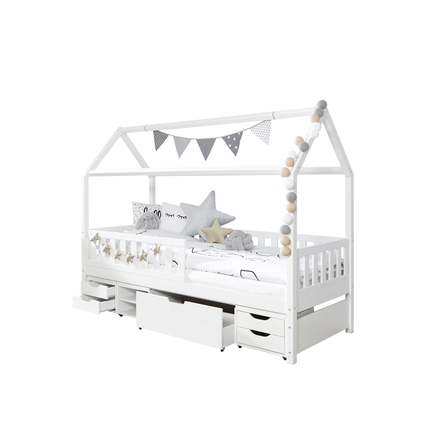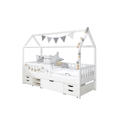 Questo letto è più di un posto comodo per far dormire il tuo bambino! La casa letto Dream House con la sua costruzione del tetto per il design individuale diventerà rapidamente il punto focale della camera del vostro bambino. Dettagli del prodotto: Colore: bianco Materiale: pino massiccio, laccato Superficie di sdraio: larghezza x lunghezza 90 x 200 cm Dimensioni: larghezza x lunghezza x altezza 209 x 96 x 169 cm Spessore del palo: 4,5 x 4,5 cm Altezza massima del materasso: 18 cm 4 cassetti funzionali aden Incluso nella consegna: Letto da casa 4 cassetti funzionali aden Attenzione: materasso, base a scomparsa, cuscini e decorazione non sono inclusi nella consegna