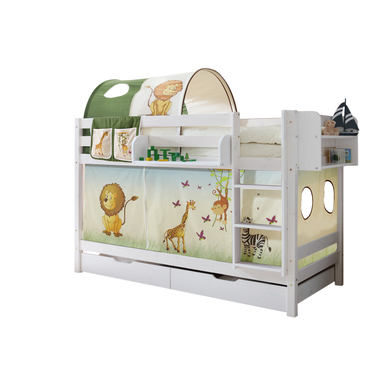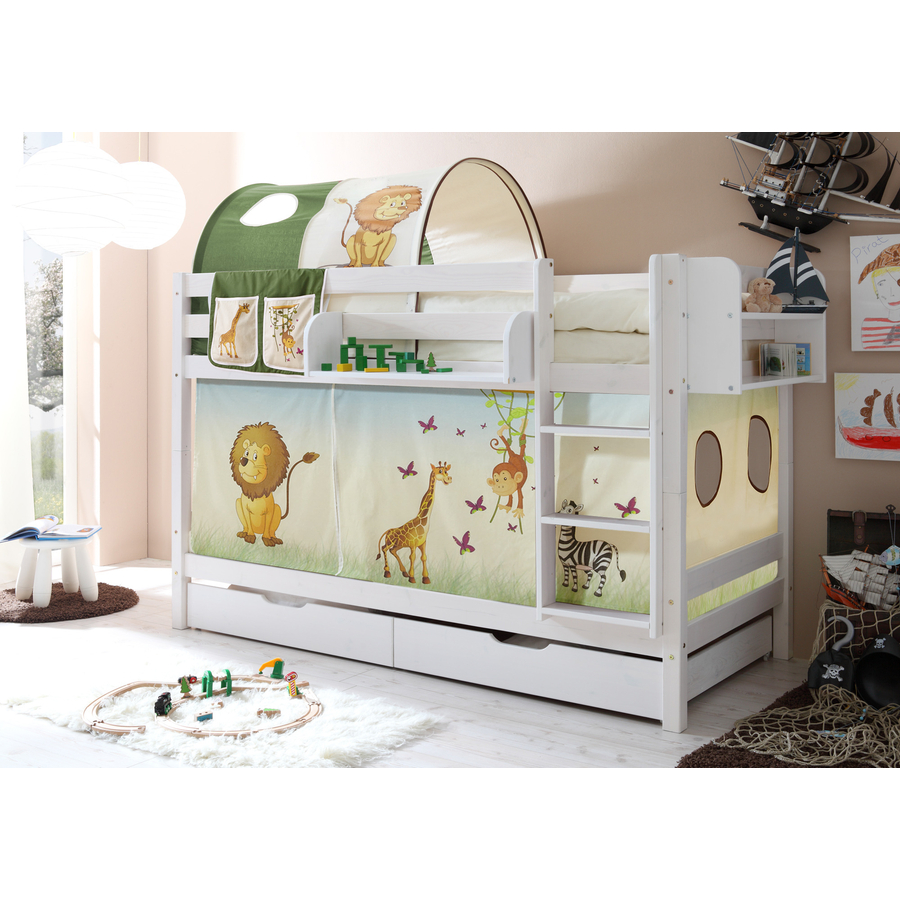 Questa struttura per la cameretta metterà tutti i fratelli d'accordo! La grotta sottostante dona una particolare atmosfera, mentre il tunnel un carattere unico. Il metodo di costruzione massiccia, per una struttura più che sicura. Grazie al pratico prodotto supplementare il letto è orientato a tutti i gusti. Dettagli del prodotto: Colore letto: bianco Colore tendina: Safari, verde Materiale letto: Pino massello, laccato Materiale tendine: 100 % cotone Superficie: 90 x 200 cm Dimensioni: Ampiezza x Lunghezza x Altezza 99 x 208 x 140 cm Spessore dei montanti: 4,5 x 4,5 cm Distanza tra i due letti: 75 cm Altezza massima del materasso: 16 - 18 cm La scaletta e può essere montata a destra o a sinistra indistintamente. Trasformabile in due letti singoli Abbinate a questo letto sono consigliate le doghe avvolgibili TICAA. Non adatto per reti a doghe con struttura. Inclusi nella spedizione: Letto a castello Tende Materiale e istruzioni per il montaggio Attenzione: Rete, materasso, cassetti, tunnel, tasca e decorazioni NON sono inclusi nella consegna! Reti, materassi e cassetti acquistabili separatamente come accessori sul nostro sito