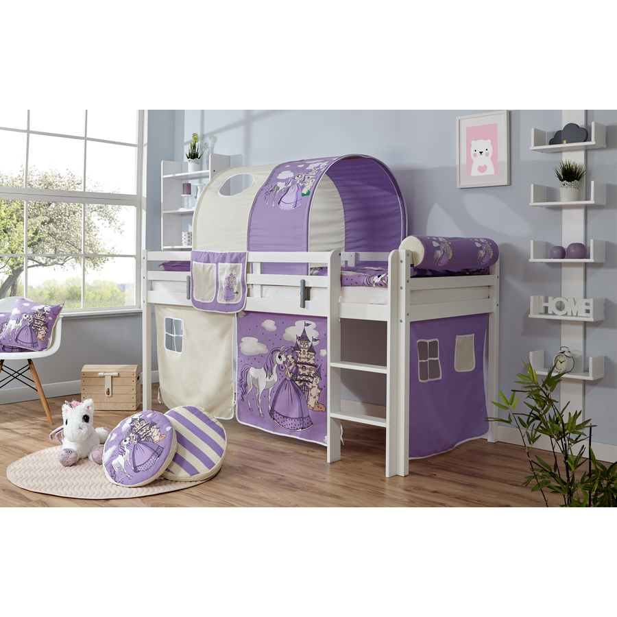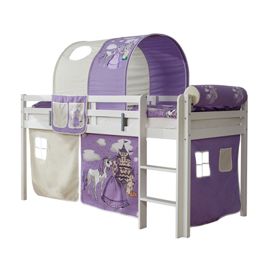 I bambini non vedono l'ora di andare a letto! La scala inclinata rende sicuro e facile salire anche per i più piccoli. Si può montare sia a destra che a sinistra. Il letto ha un pratico spazio di stoccaggio sotto la superficie di sdraio. Dettagli del prodotto: Letto rialzato Colore: bianco Materiale: faggio massiccio, laccato Superficie di sdraio: larghezza x lunghezza 90 x 200 cm Dimensioni: larghezza x lunghezza x altezza 121 x 207 x 110 cm Max. altezza del materasso: 15 cm Spessore del piede: 4,5 x 4,5 cm Altezza della nicchia: 76 cm La scala inclinata può essere montata sia a destra che a sinistra Pratico spazio di stoccaggio sotto la superficie di sdraio Solo le reti a doghe avvolgibili marchio TiCAA sono raccomandate per questo letto. Materasso MedAllergen Dimensioni: larghezza x lunghezza x altezza 90 x 200 x 14 cm Materiale: schiuma comfort Materiale rivestimento: 100 % poliestere Il rivestimento è rimovibile Istruzioni per la cura: rivestimento lavabile fino a 60 °C Classe di durezza II Clima di sonno piacevole e sano grazie ai materiali naturali Clima asciutto per dormire Non vengono utilizzati irritanti Particolarmente adatto a chi soffre di allergie Rete a doghe avvolgibile Dimensioni: larghezza x lunghezza x altezza 90 x 200 x 146 cm Materiale: pino massiccio Senza telaio Composta da 11 doghe tenute insieme da cinghie tessili antistrappo Le doghe rigide garantiscono stabilità e comfort di riposo Adatto a tutti i tipi di materasso Il materiale per il fissaggio al letto non è compreso nella fornitura Set di tessuti Colore: viola-beige con motivo Dimensioni: parte anteriore: lunghezza x altezza 189 x 74 cm / parte laterale lunghezza x altezza 88 x 74 cm Materiale: 100% cotone Può essere fissata con nastro velcro Elevata facilità d'uso della pelle Consiste in tenda, tunnel e tasca Incluso nella consegna: Letto rialzato Rete a doghe avvolgibile Materasso Set di tessuti Attenzione: mensola, paracolpi e decorazioni NON sono inclusi.