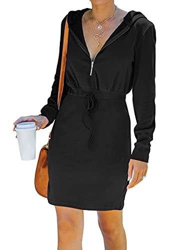Ticticlily Abito Elegante Donna Vestito con Cappuccio Autunno Inverno Manica Lunga e Scollo V con Cerniera Vestiti Pullover Felpe Abiti Casuale Tinta Unita Nero M