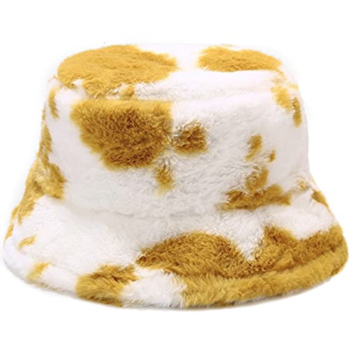 Tidefire - Cappello da secchio, con stampa mucca, caldo in finta pelliccia, per donne e ragazze, giallo, Taglia unica