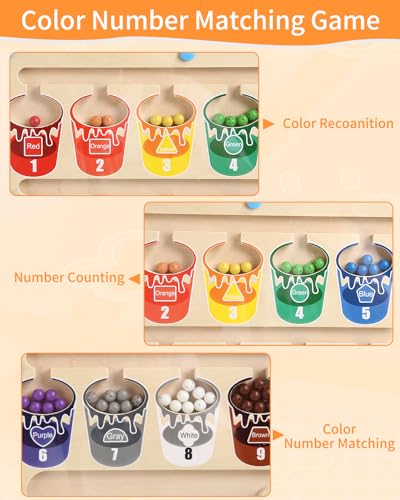 ✍【Gioco magnetico Montessori Giocattolo】Ci sono 55 perline magnetiche in totale sulla pista della tavola di legno, 10 colori diversi di "barattoli di vernice", i bambini possono contarli. Il colore e il numero delle palline corrispondono al colore e al numero dei barattoli.