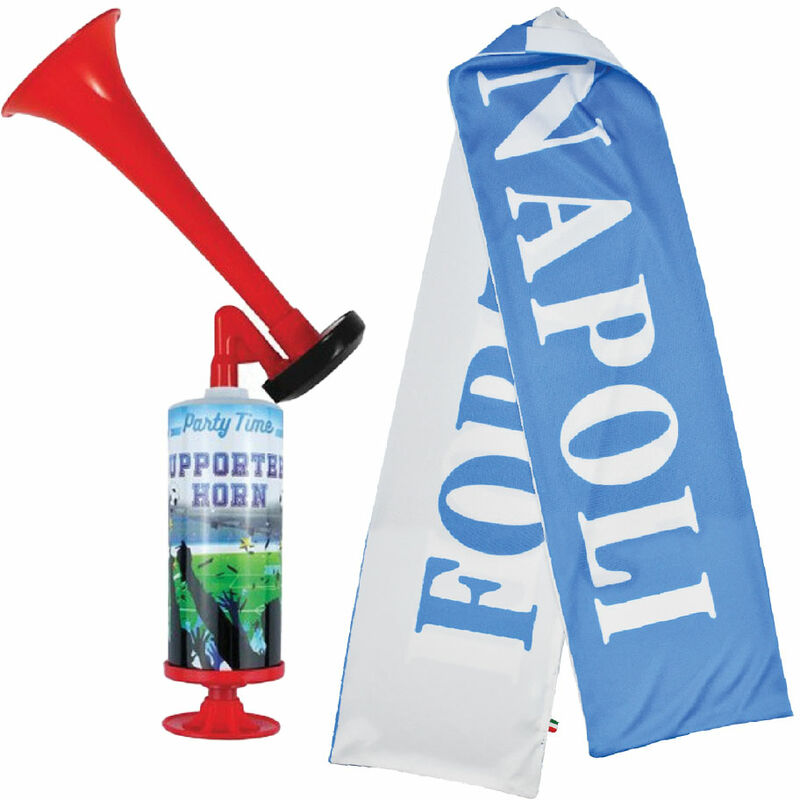 Composizione set: 1 trombetta da stadio manuale senza gas 'air horn', 1 sciarpa in tessuto 'forza napoli' cm 19x1,2 mt.2 pezzi