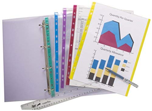 Tiger Stationery - Buste portadocumenti formato A, in polipropilene, con fori, pezzi, trasparenti, Blue/Clear/Green/Purple/Red/Yellow, A4 Coloured Edge x 25