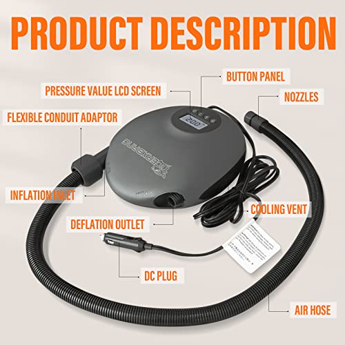Gonfiaggio e svuotamento ad alta efficienza: la pompa elettrica SUP ha una potenza fino a 20 PSI e il doppio cilindro attrezzato può gonfiare rapidamente il SUP. La pedana gonfiabile da 10,6 piedi può raggiungere 12 PSI in circa 8 minuti e 15 PSI in 10 minuti. Ideale per l'uso su gommoni ad alta pressione.