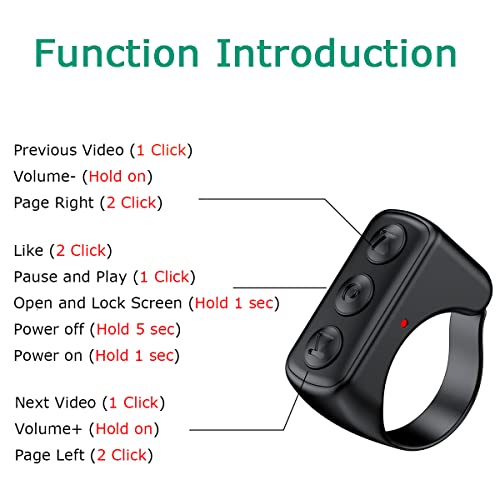 Telecomando Bluetooth Tik Tok: ideale per scorrere tiktok sempre e ovunque. Quando hai freddo, stanchi e pigri a letto, puoi usare questo anello a mani libere per scorrere Tik Tok e rendere la pagina su e giù, volume su e giù, riprodurre e mettere in pausa, inviare Mi piace. (Impossibile controllare le app di riproduzione musicale)