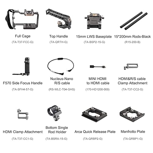 Questo kit della gabbia serie Panasonic GH include: la base gabbia Panasonic serie GH, maniglia superiore a sgancio rapido, cinturino Tilta, cinturini Arca e Manfrotto, piastra di base LWS da 15 mm per accessori di montaggio (nonché un morsetto di montaggio singolo da 15 mm ), un cavo HDMI maschio a HDMI femmina, nonché un morsetto per collegare comodamente il cavo HDMI alla gabbia e un morsetto per collegare comodamente sia il cavo HDMI che Nucleus Nano R / S alla gabbia.