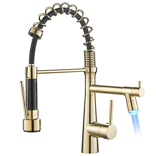 TIMACO - Rubinetto da cucina con LED con molla a spirale, rubinetto girevoli a 360° con due beccucci, doccetta estraibile, ad alta pressione, in nichel spazzolato
