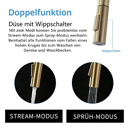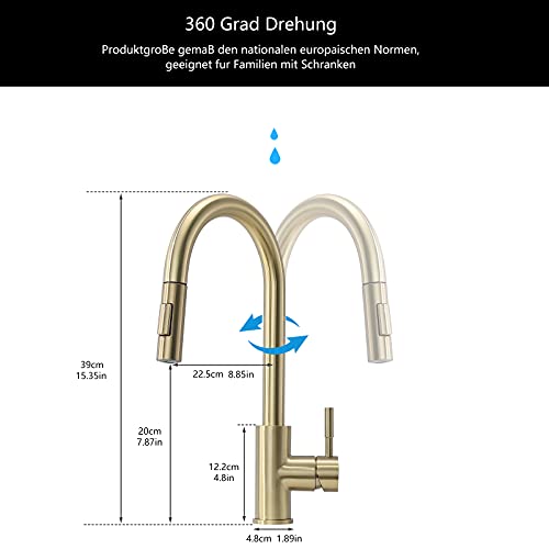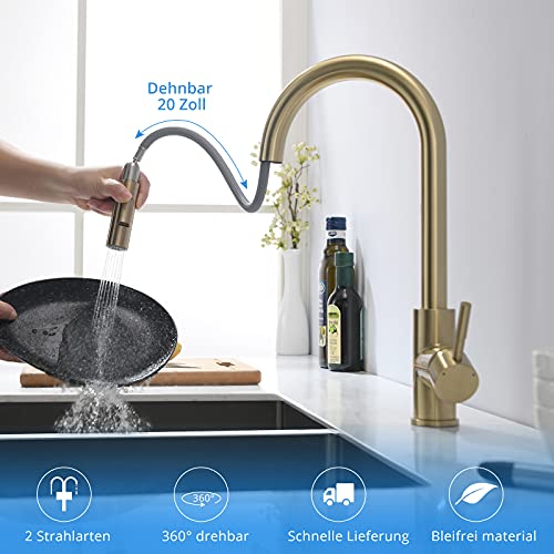 TIMACO - Rubinetto da cucina in oro spazzolato con doccetta estraibile, girevole a 360°, miscelatore per cucina, miscelatore monocomando per lavello da cucina