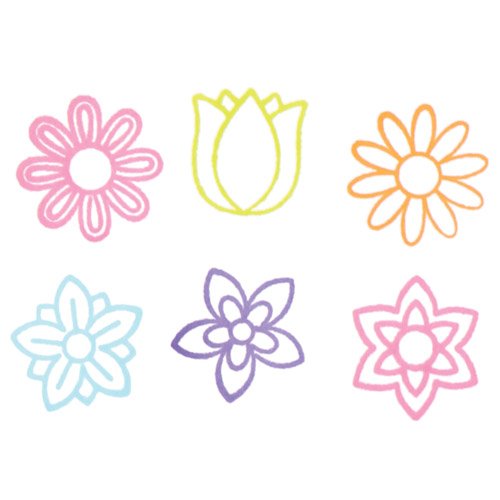 Timbrini con inchiostro incorporato in 10 soggetti floreali e in 5 colori assortiti.