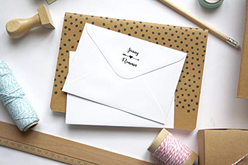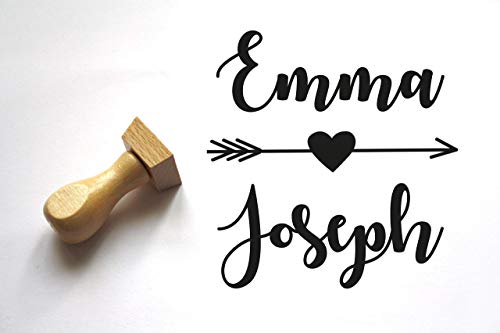 Timbro matrimonio personalizzato con nomi, conome, forma quadrata, cuore e freccia
