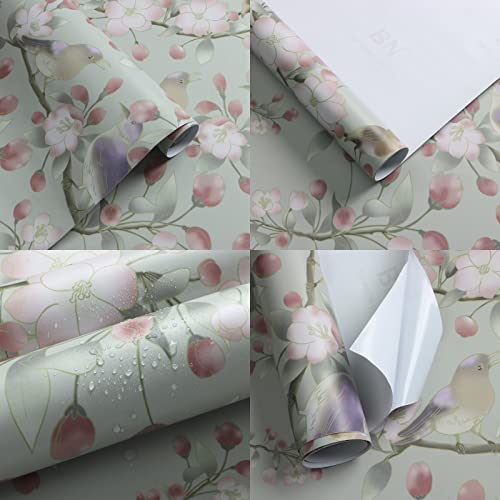 Timeet Carta da Parati Autoadesiva Fiori Vintage Verde Pellicola Adesiva Motivo per Mobili Foglie di Uccelli Pellicola per Impermeabile Adesivi per Mobili Pellicola in Vinile per Cucina 41x300CM