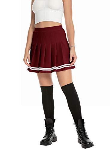 Timormode Donna Gonna A Pieghe Mini Alta Vita Pattinatrice Svasato Studentessa Tennis, Burgundy White Strip, XS