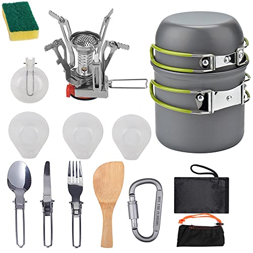 1. 【Set di pentole da campeggio all-in-one】: set di pentole da campeggio da 13 pezzi, tra cui 1 mini fornello, 1 pentola piccola, 1 coperchio piccolo, 3 ciotole, 1 spatola in legno di bambù, 1 cucchiaio da minestra, 1 cucchiaio di riso, 1 cucchiaio forchetta, 1 spugna per la pulizia, 1 moschettone e 1 borsa. Adatto per 1-2 persone, la migliore attrezzatura per gli amanti dei picnic e dei campeggiatori.