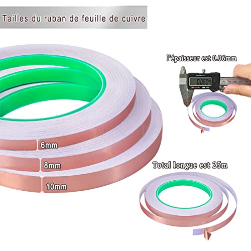 La confezione comprende: 3 rotoli di strisce di rame a doppia conducibilità in 3 misure: 6 mm/8 mm/10 mm di larghezza, ogni striscia di rame è 25 m. Il peut répondre à vos besoins de tailles différentes pour vos projets