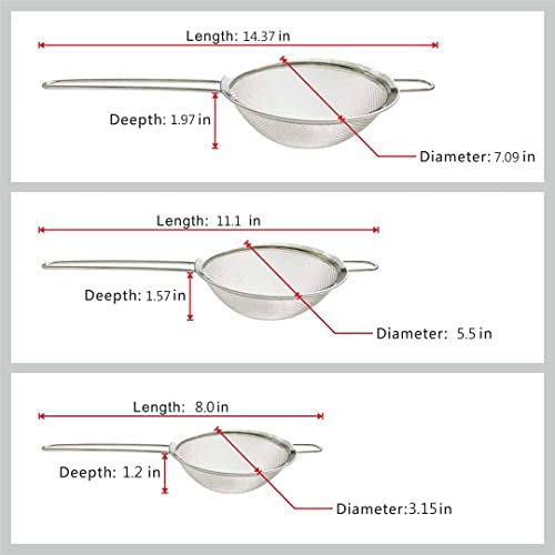 3 MISURE PER DIVERSE ESIGENZE: la confezione contiene 3 setacciare la farina in acciaio inox di alta qualità con diversi diametri: 8 cm, 14 cm e 18 cm. Puoi sempre trovare il filtro giusto per il lavoro. I filtri a maglia fine con manico sono perfetti per setacciare e filtrare ingredienti bagnati o asciutti, anche in caso di uso ripetuto.