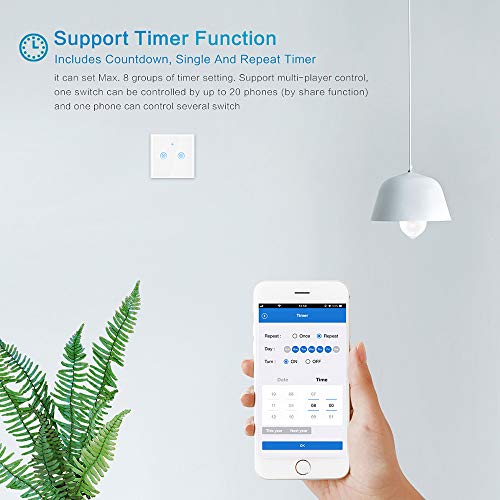 Funzione forte: funzione timer di supporto che include conto alla rovescia, timer singolo e ripetuto, può impostare Max. 8 gruppi di impostazioni del timer. Supporta il controllo multi-player, un interruttore può essere controllato da un massimo di 20 telefoni (per funzione condivisione) e un telefono può controllare diversi switch (dipende dal rilevamento del router in uso pratico).