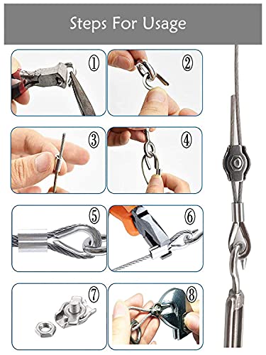 【Pacchetto incluso】 - Fune metallica rivestita in PVC da 30 m, 6 tenditori a occhiello M5, 12 ditali per fune metallica M2, 12 cinghie per occhielli in filo M5, 32 anelli di crimpatura in alluminio M2, 4 ganci di espansione M6, 4 moschettoni M5, 12 pezzi 8 * 40 viti di espansione, 12 pezzi M3 morsetto singolo