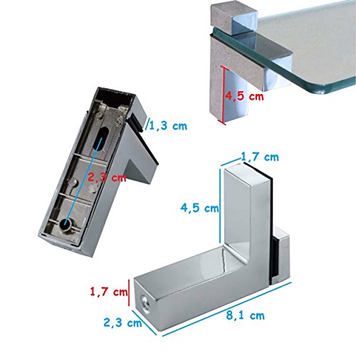 Aspetto elegante: i morsetti di fissaggio sono realizzati in metallo cromato, sono di alta qualità e hanno un aspetto elegante. Valorizza i tuoi ripiani in vetro o in legno o i tuoi vetri di qualsiasi tipo. Adatto fino a un massimo di 25 mm di spessore.