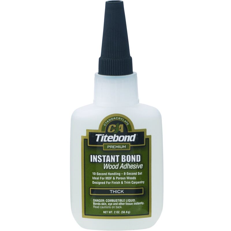 Titebond Instant Bond è un sistema di incollaggio in due parti che richiede tra 5 - 15 secondi per impostare e 30 - 60 secondi per la cura iniziale. Fornisce un legame forte e permanente ed è ideale per giunti difficili da raggiungere o superfici difficili da serrare. Progettato principalmente per prodotti in legno e legno, questo adesivo è anche molto efficace su un'ampia varietà di materiali e substrati. Il prodotto a viscosità spessa offre un tempo di assemblaggio di 10 secondi e una velocità di polimerizzazione iniziale di 8 secondi. È ideale per l'incollaggio di grani finali in un'applicazione di giunzione mitra, assemblaggio rapido di maschere e infissi, aderendo ai blocchi di tornitura su una piastra frontale per un uso immediato.