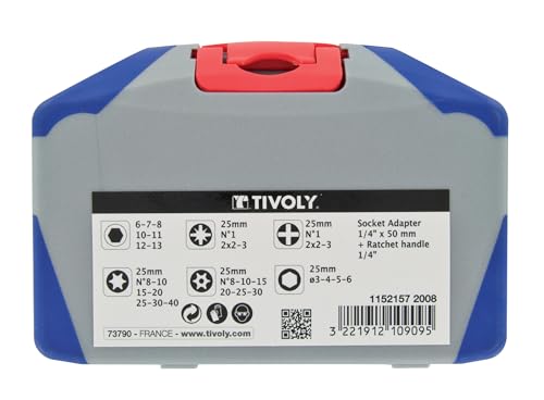 Tivoly - Set di 34 punte torsione + bussole + impugnatura a cricchetto e adattatore a bussola, punte di avvitamento performanti, per un facile utilizzo
