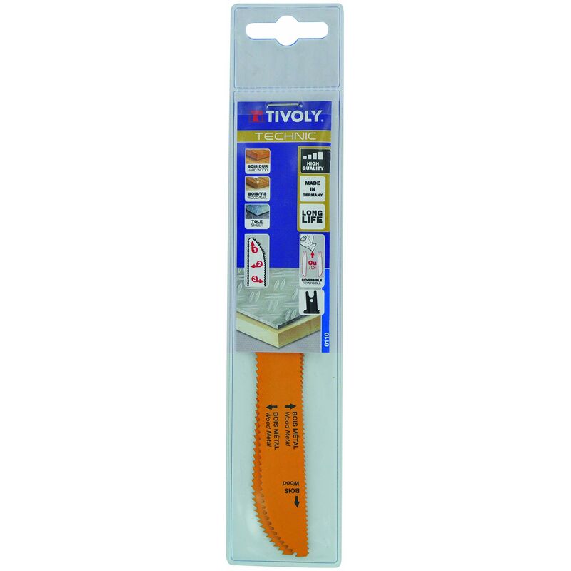 Set di 2 lame per sega a sciabola Multi-Cutter, taglio legno tenero / legno di costruzione, MDF, legno con chiodi, metallo/acciaio, plastiche rinforzate, epossidiche, diversi spessori. Attacco universale doppio per inserimento in entrambe le direzioni. Tivoly si inserisce in un approccio costante di innovazione. Certificato ISO 9001 versione 2015