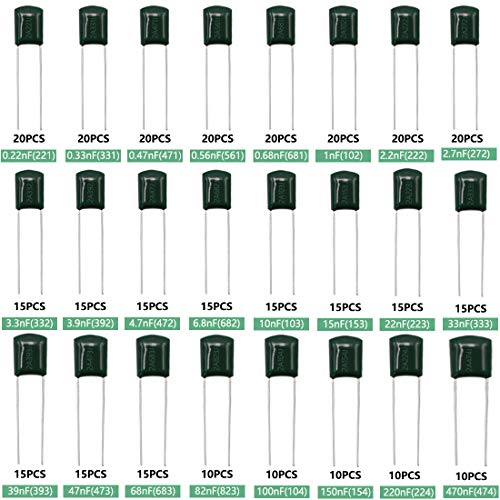 Tnisesm 375 Pcs 24 Value Metalized Mylar Polyester Film Condensattors Assortment Kit 0.22nF - 470nF 100V in a Box Tn-20-4