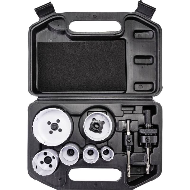 Dettagli tecnici Diametro albero 6.3 mm, 11.1 mm Diametro di foratura 22 mm, 29 mm, 35 mm, 44 mm, 51 mm, 68 mm Dimensione del prodotto, larghezza 160 mm Dimensione del prodotto, lunghezza 217 mm Dimensioni prodotto Altezza 63 mm Idoneità del materiale Legno, PVC, Metallo, Metalli non ferrosi Lunghezza totale 49.5 mm Materiale punte HSS bi metallica, HSS, Acciaio al carbonio Peso 1.13 kg Tipo prodotto Kit seghe a tazza Trapani Caratteristiche Con griglia di protezione Kit 6 seghe a tazza HSS bimetalliche Il kit di seghe a corona di 6 pezzi consente, ad esempio, di effettuare fori su tubi o scatole di derivazione. Adatto per legno, PVC, metallo / metalli non ferrosi Punti di forza e dettagli Ø 22 - 68 mm Adatto per legno, PVC, metalli e metalli non ferrosi Elevata concentricità Struttura stabile Incluso nella consegna Seghe a corona Ø 22/29/35/44/51/68 mm, Chiave esagonale, Albero esagonale 7/16 (11.1 mm), 1/4 (6.35 mm), Valigetta, Istruzioni per l'uso Requisiti di sistema null