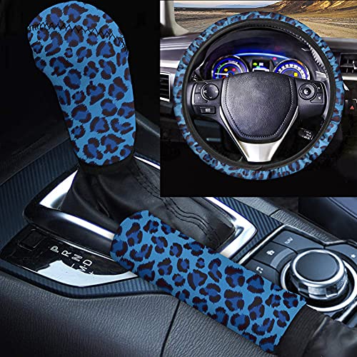 TOADDMOS Coprivolante auto con stampa leopardata blu con pastiglie freno a mano, set di 3 pezzi auto interno pomello del cambio, accessori automobilistici universali