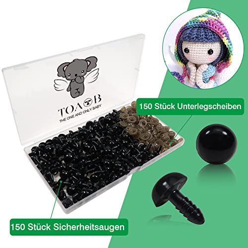 TOAOB 150 occhi di sicurezza 12 mm nero plastica fai da te bambole occhi a bottone con rondelle per animali all'uncinetto, bambola, pupazzo di peluche occhi di orsacchiotto