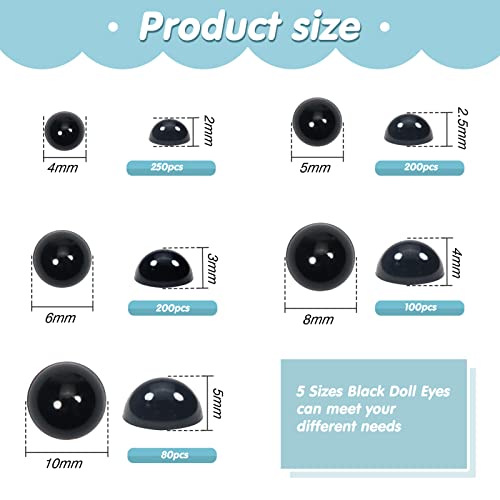 TOAOB 830 pezzi Occhi per Bambole Mezze Perle Nere 5 Dimensioni Rotondo Sicurezza Occhi in Plastica 4mm 5mm 6mm 8mm 10mm per Amigurumis Pupazzi Fai da Te Artigianato