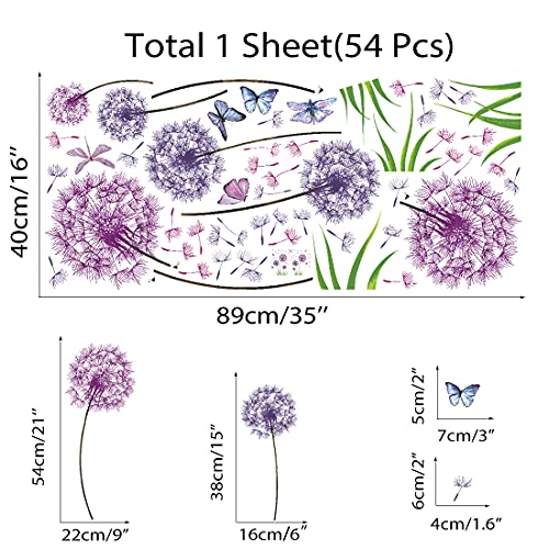 TOARTI 54 adesivi da parete grandi con dente di leone, per camera da letto, farfalle, fiori, decorazione da parete, per camera da letto, soggiorno, camera dei bambini, 54 pezzi