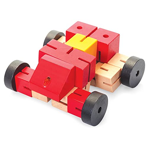 Giocattolo robot fatto da diversi blocchi di legno collegati tra loro. La formazione standard è una figura robotizzata, ma le parti possono essere riposizionate per formare una varietà di forme diverse di auto e veicoli. Età 3+