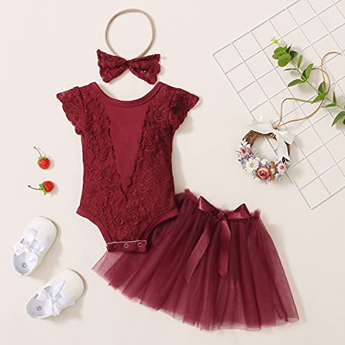 3PCs Toddler Girl Pagliaccetto Tuta Neonato Vestito da Festa T-Shirt Neonato T-Shirt Top Fiocco Fascia Principessa Tutu Vestito Gonna in Tulle Abiti Casual Set di Abiti (Rosso, 6-12 Mesi)