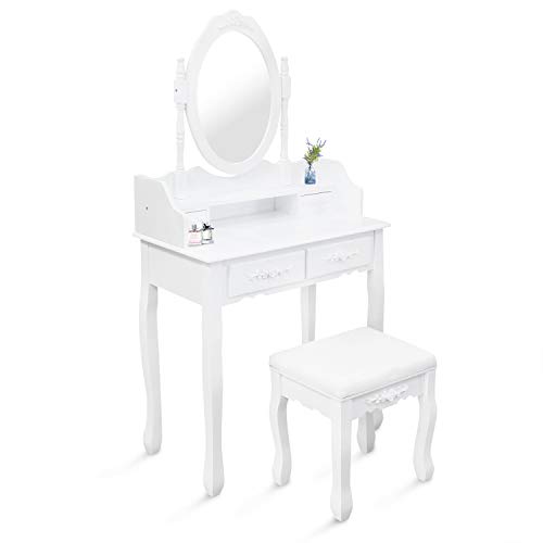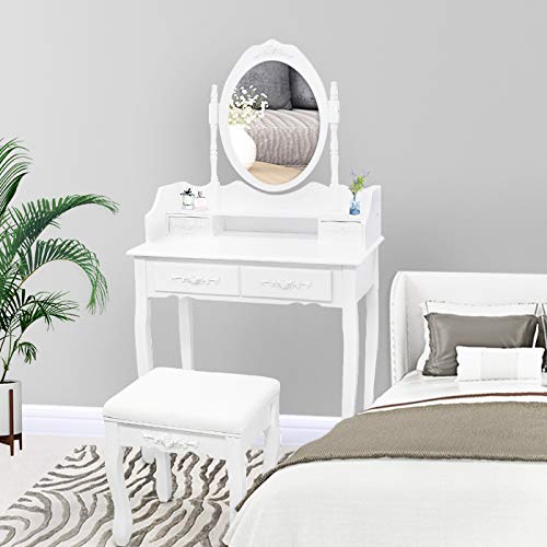 Todeco - Toletta Da Trucco, Tavolino Da Trucco - Materiale: MDF - Dimensione dello specchio: 38,1 x 55,1 cm - 4 cassetti, specchio ovale con modanatura, Bianco