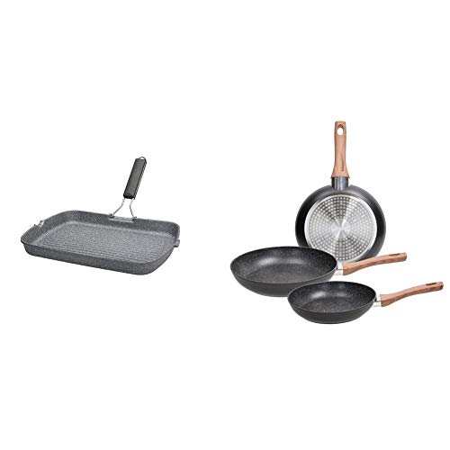 Tognana WI758BDAMNF Grill Rettangolare con Manico Pieghevole Mythos, Alluminio, Grigio, 1 & Set 3 padelle 20-24-28 cm, Alluminio, anche a Induzione, Nero