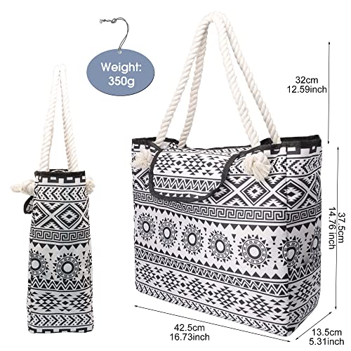 Tokeya Borsa da Spiaggia in Tela, Borse Mare Grande XXL Pieghevole Donna Beach Tote Bag Leggero Borsone a Tracolla Shopper Estive con Comodi Manici in Corda per Viaggio Shopping,Bianca Nera
