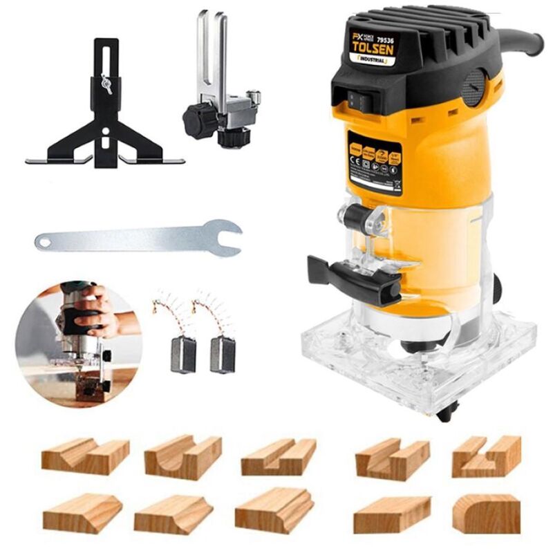 Omologazione CE Potenza in ingresso: 500 W Tensione nominale: 220-240 V Frequenza: 50/60 Hz Velocita' a vuoto: 33500 giri/min Diametro mandrino: 1/4" e 6 mm Scala graduata per la regolazione della profondita' di rifilatura Base in plastica trasparente per una visione chiara del bordo di rifilatura, 2 guide.